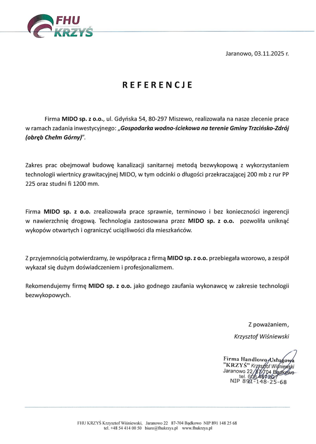 Zakres prac obejmował budowę kanalizacji sanitarnej metodą bezwykopową z wykorzystaniem technologii wiertnicy grawitacyjnej MIDO, w tym odcinki o długości przekraczającej 200 mb z rur PP 225 oraz studni fi 1200 mm.